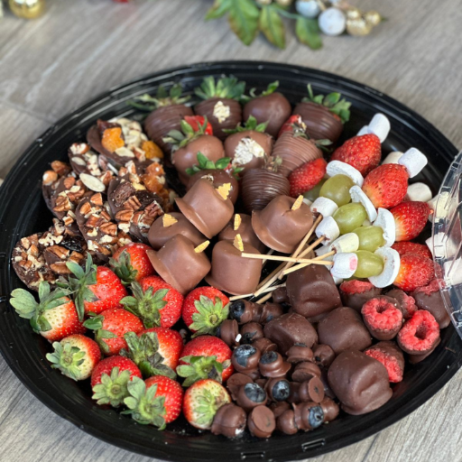 Celebra en grande: charola festiva con frutas y chocolates. Perfecta para reuniones y regalos.